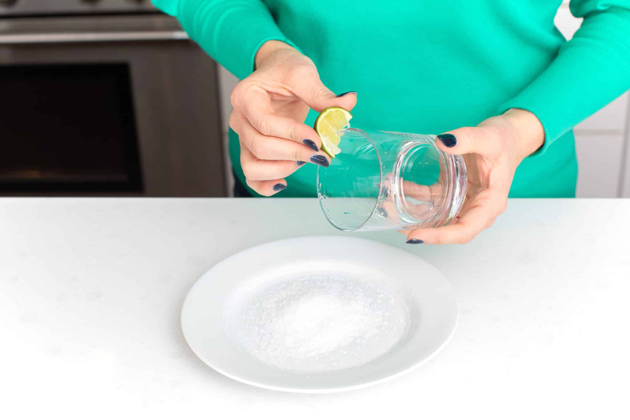 - Rim the glasses with salt by rubbing eat glass with a lime wedge. Place salt on a small plate then rub the glass around to coat the rim with salt. Fill each rimmed glass with ice.2 lime wedges, 2 tablespoons Kosher salt
