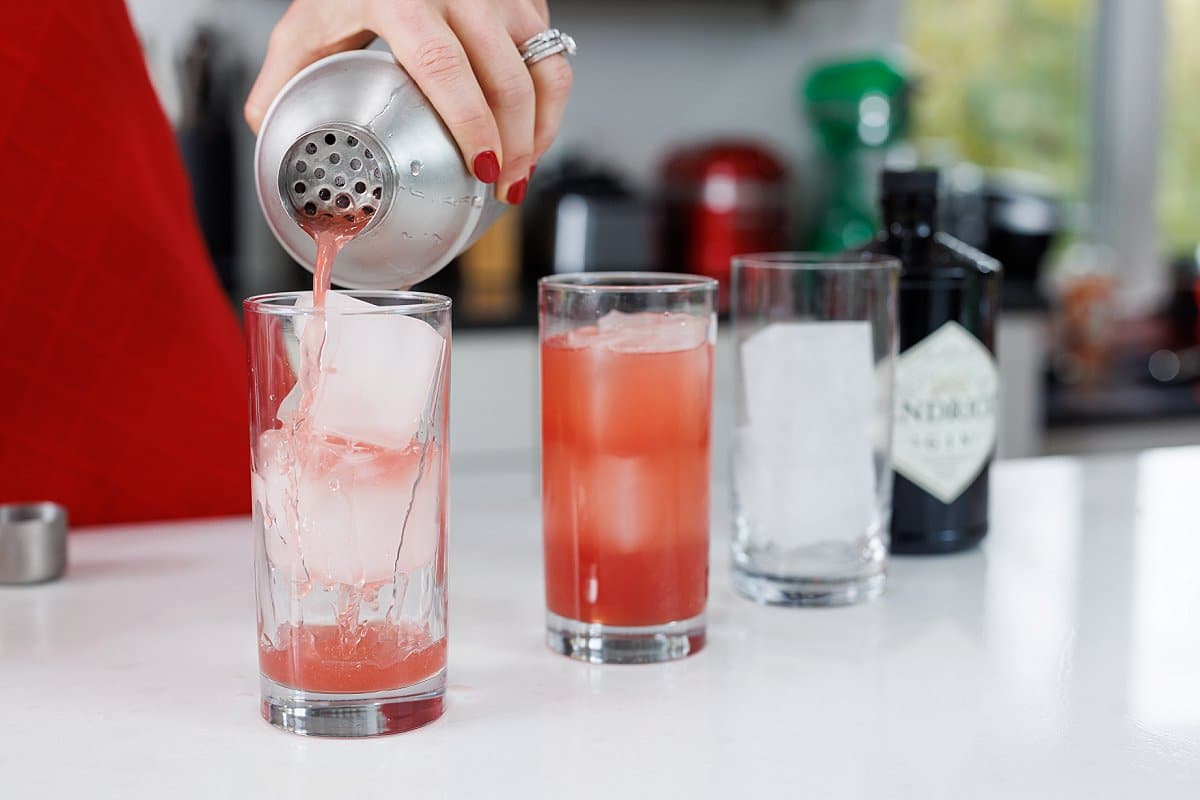 Start by filling four tall glasses with ice, and putting ice in a cocktail shaker. Then pour the cranberry juice into the shaker as well.