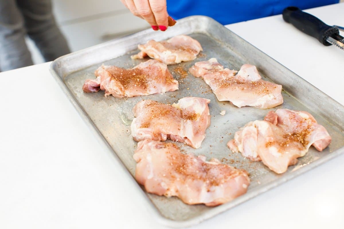- Pre-heat oven to 400 degrees and place chicken thighs in a single layer on a baking sheet. Brush both sides with olive oil.