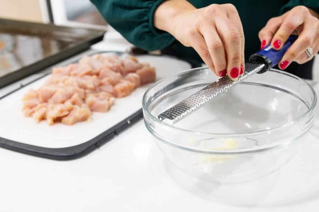 Step 2. Then take a large bowl and use a microplane to grate in your garlic cloves.