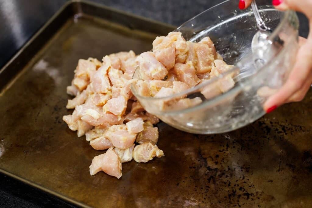 Step 4. Toss the chicken in the marinade, and make sure everything is evenly coated. Let marinate for at least 30 minutes, then pour onto a prepared baking sheet.