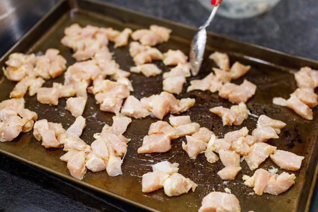 Step 5. Spread the chicken evenly on the sheet pan, then bake in the oven at 350 for about 20 minutes.