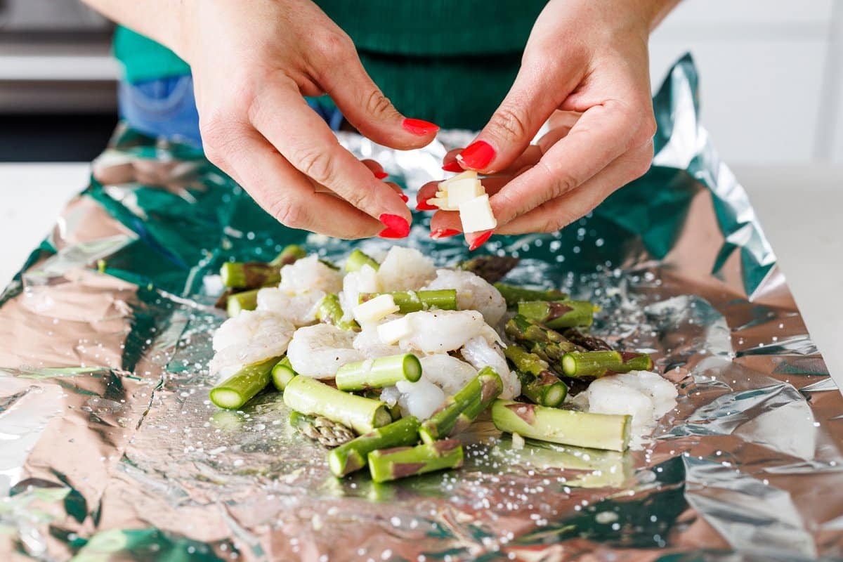 - Divide the shrimp and asparagus evenly between the four foil sections and place in the center. Top each with a little bit of the garlic, butter, lemon zest, lemon juice and salt and pepper to taste.
