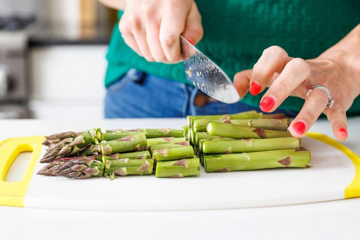 Start your shrimp and asparagus pouches by trimming your asparagus spears into 2 inch pieces and throwing out the more woody ends. I like to use thicker asparagus when cooking on the grill.