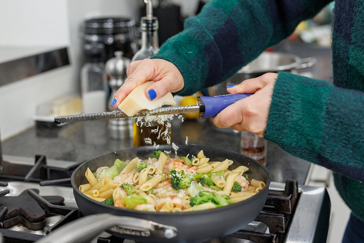 Finish with the freshly grated parmesan cheese before tossing everything together, making sure it’s all evenly coated with the sauce and warmed through.