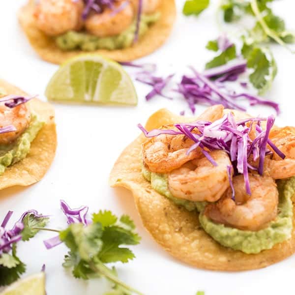 These healthy baked tostadas are topped with creamy guacamole and sautéed shrimp.