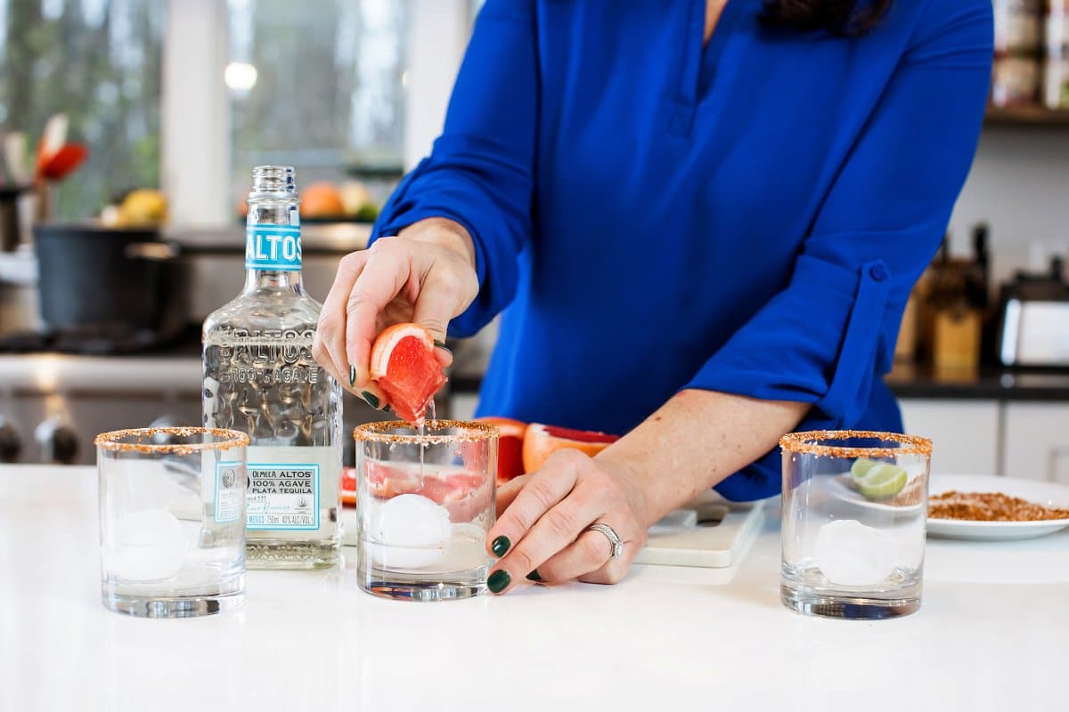 Next, slice the grapefruit and lime, and squeeze the juice. Use a cocktail shaker to combine the tequila, lime juice, grapefruit juice, and ice. Fill the glasses about 2/3 of the way full with mixture. Finally, top each drink off with sparkling water, and enjoy!