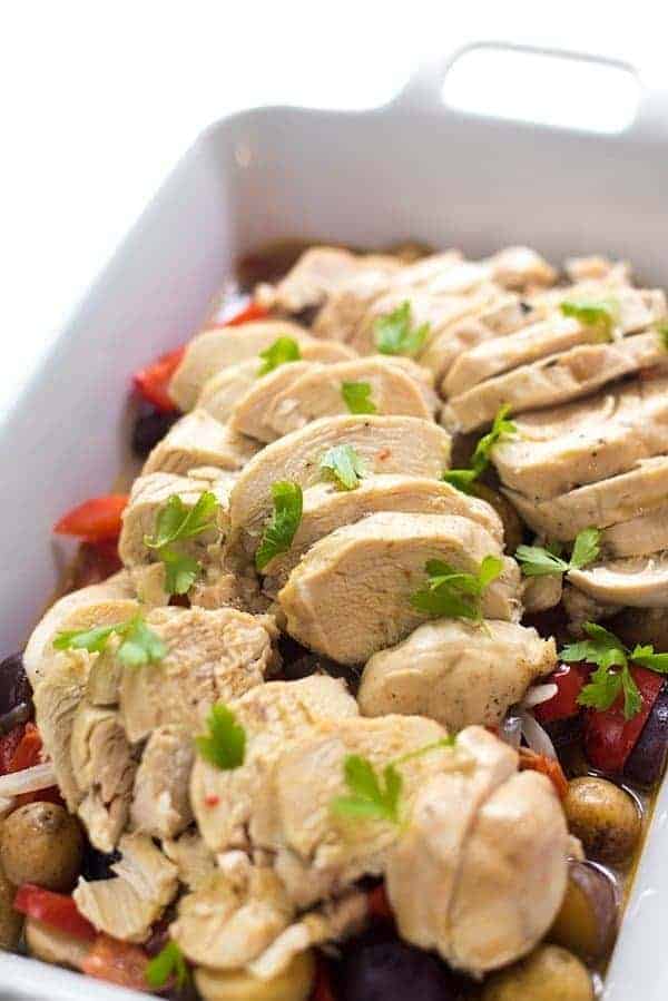 To maximize flavor, the chicken and vegetables are seasoned liberally with salt, pepper, oregano and garlic powder. I also love adding in a splash of red or white wine if I have some laying around but it’s optional.