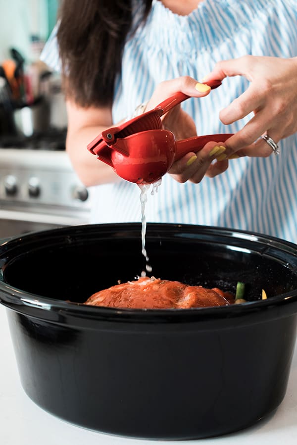 - Add beef broth, crushed tomatoes and lime juice to the slow cooker and cover with lid. Heat on Low for 8 hours or High for 4 hours. Shred with a fork before serving with rice, in tortillas or on a salad.