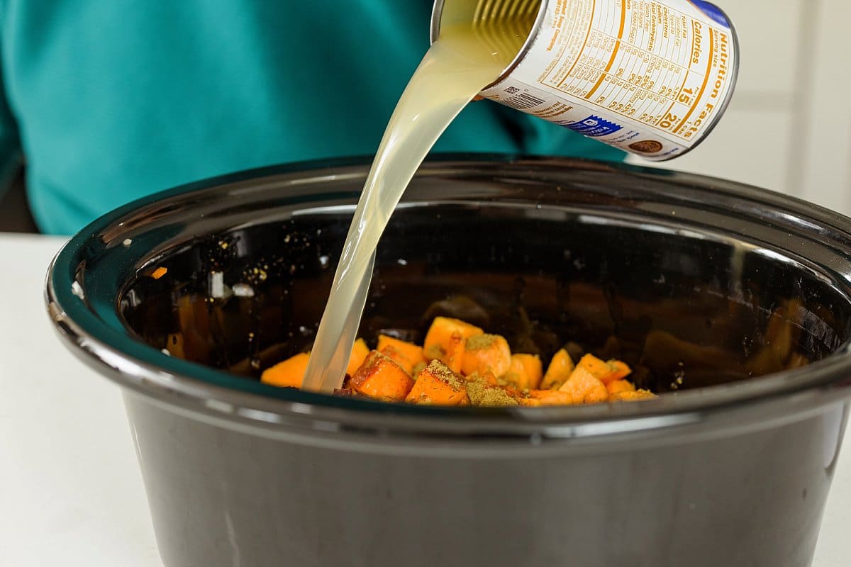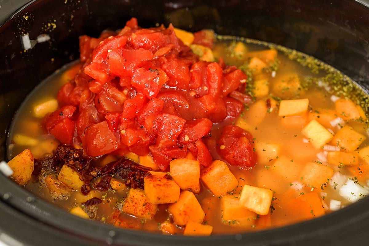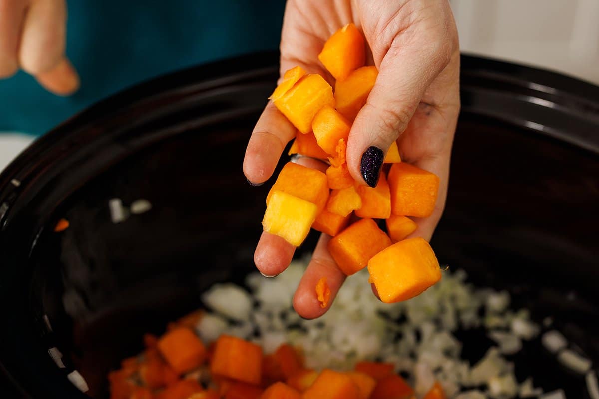 Then add the diced onion, red pepper, and butternut squash to your slow cooker.
