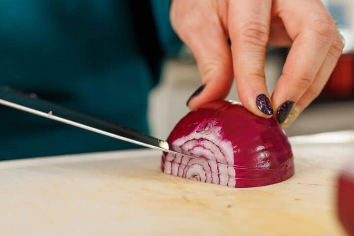 - Red onion: Adds bright, fresh color and some strong onion flavor.