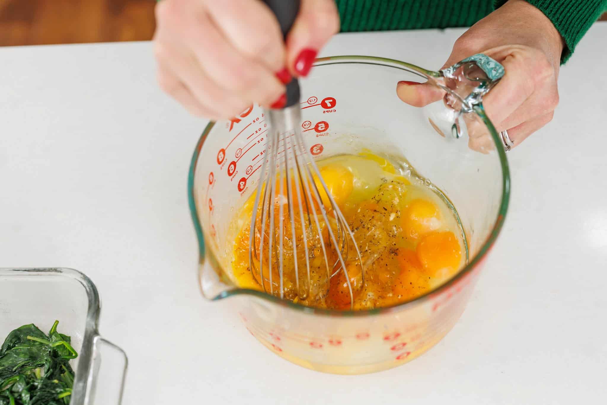 Once your eggs are all beaten, pour the mixture into the baking dish over the spinach.