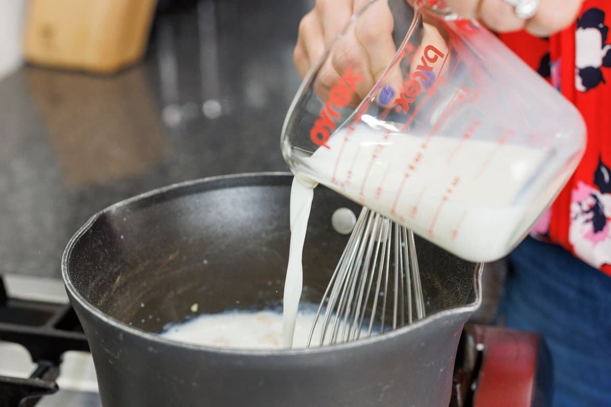 3. Pour in the milk and bring the mixture to a low boil, whisking occasionally.
