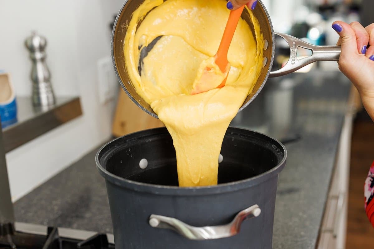 Start your stovetop mac and cheese by bringing a salted pot of water to a boil, then cook your pasta according to package instructions.