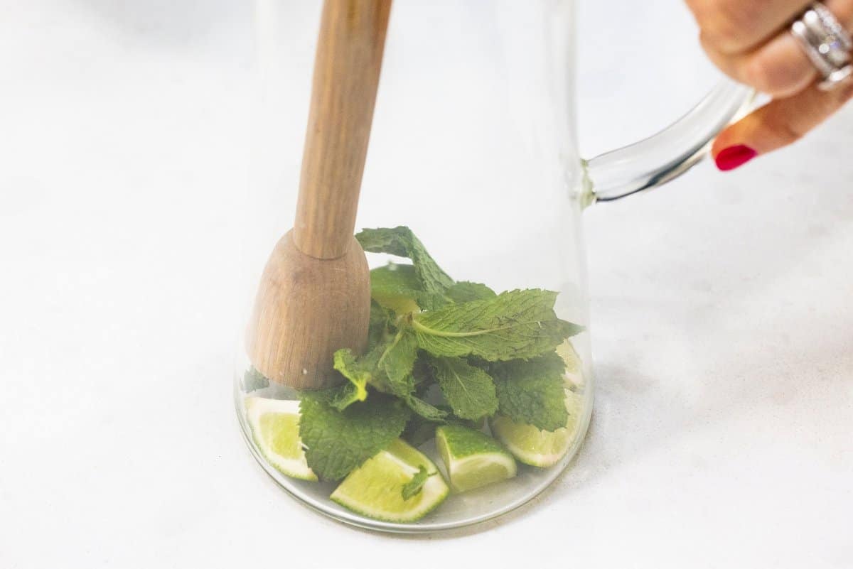 - Take one of limes and cut in half then quarter each half. Place lime wedges in a large pitcher along with mint leaves and strawberries. Using a muddler or the back of a wooden spoon start mashing the fruit and herbs together to release the flavors.