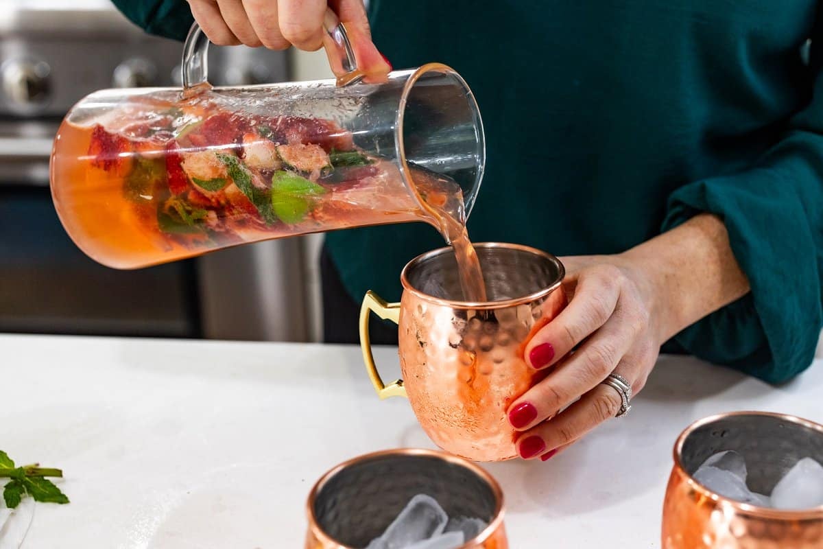 Moscow Mules are one of my favorite cocktails for entertaining. Refreshing and citrusy with a kick of ginger and sweetness, they are always a crowd favorite. Throughout the year I love to change up the traditional Moscow Mule recipe by adding in various seasonal ingredients. If you love a Moscow mule, try my cranberry Moscow mule, pomegranate Moscow mule or a spicy apple cider mule. If you like to experiment with your cocktails like I do, then you’ll love these Strawberry Moscow Mules!