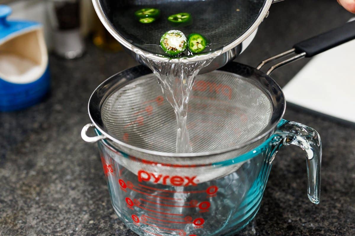 Once the water and sugar are fully combined and the sugar is dissolved, add the sliced jalapeño. Or you could infuse it with fresh ginger or mint!