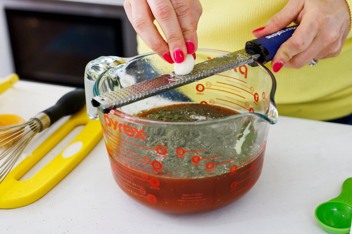 As there can never be enough garlic, using a microplane add garlic to the sauce.