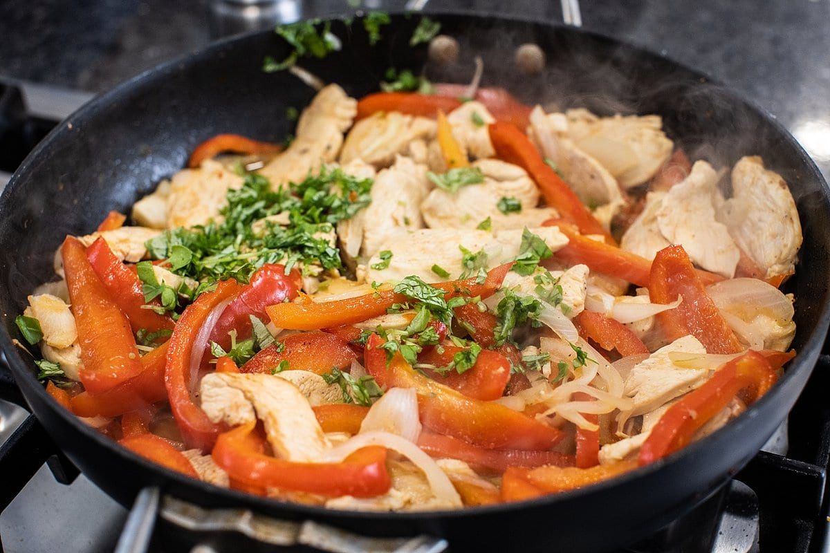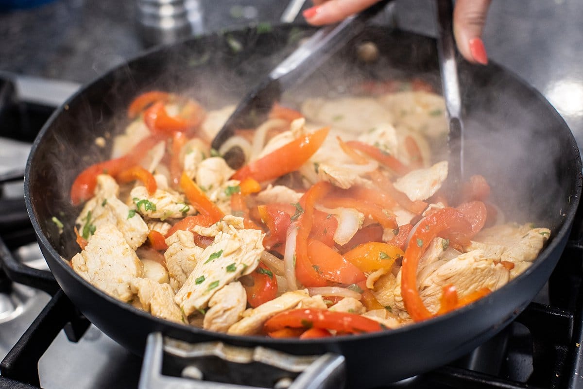 - Add peppers and onions to the pan along with a pinch of salt and pepper. Stir-fry, stirring frequently, until tender, about 5 minutes.