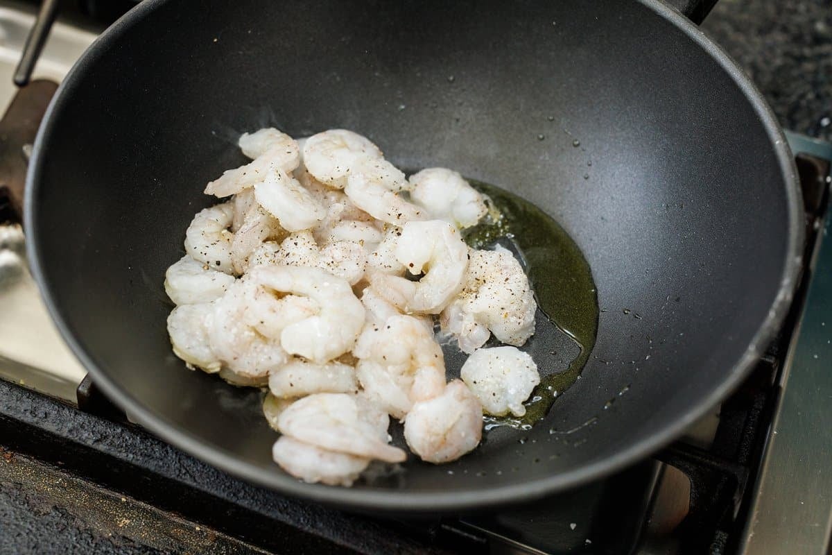 - Pre-heat a large wok or deep frying pan over medium-high heat. Sprinkle shrimp with salt and pepper and spray pan with cooking spray. Saute shrimp until they turn pink, turning once, about 90 seconds per side. Be careful not to overcook. Remove shrimp from pan and set aside.
