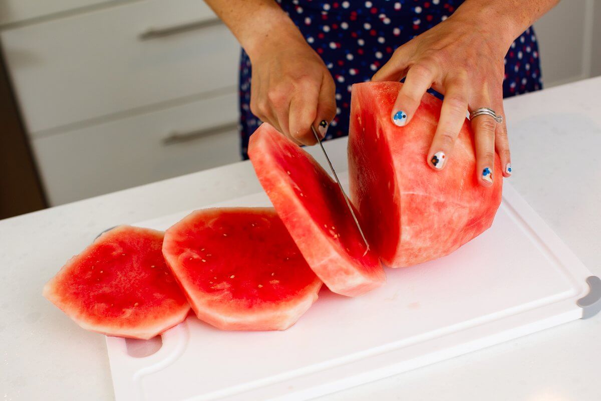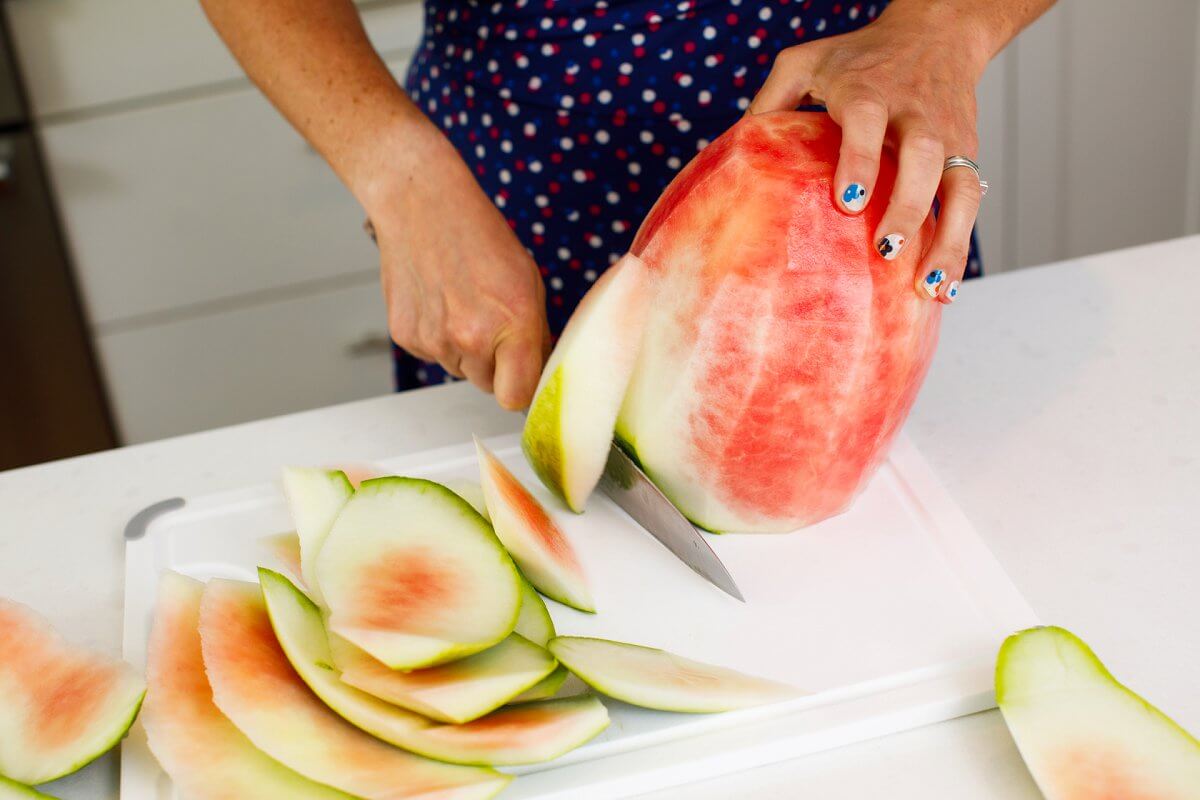 If you follow the natural curve of the watermelon, you’ll see little to no waste of the red flesh.
