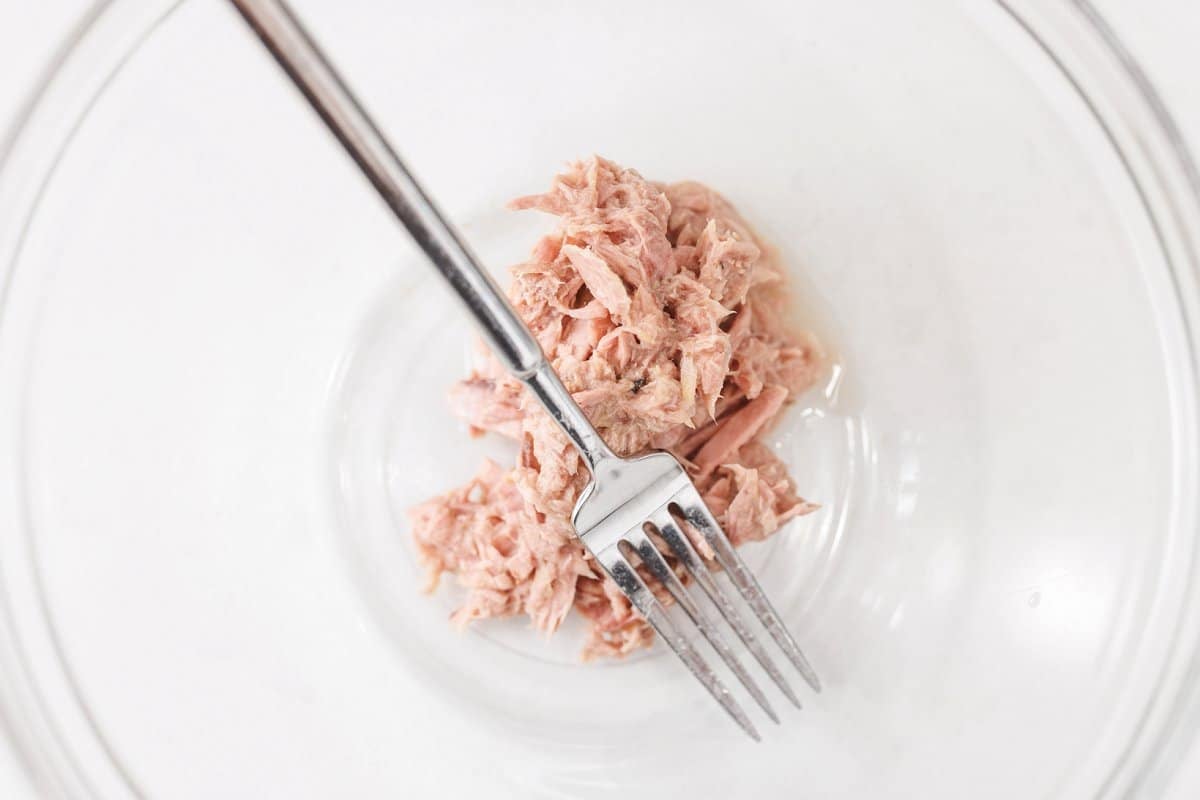 Then in a large bowl, add the drained canned tuna.