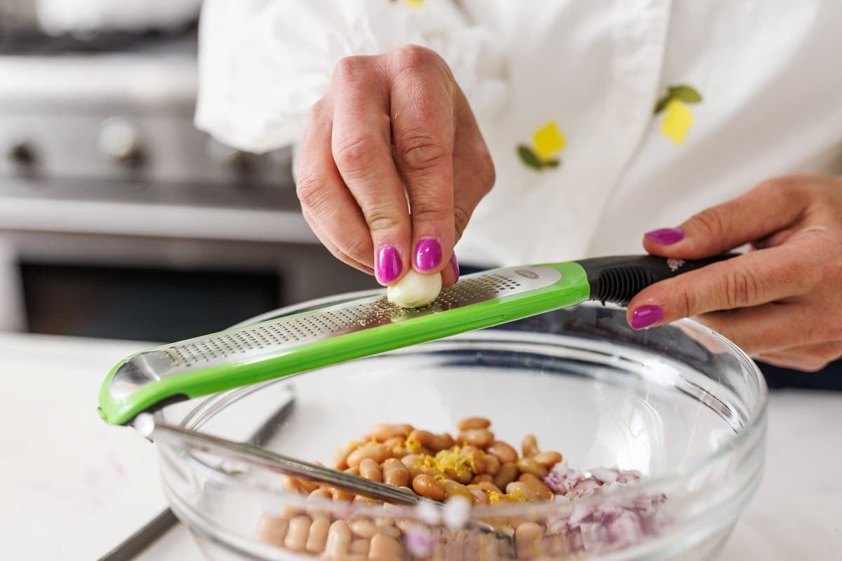 - Add lemon zest, lemon juice, garlic, and olive oil directly over the bean mixture and mix well.