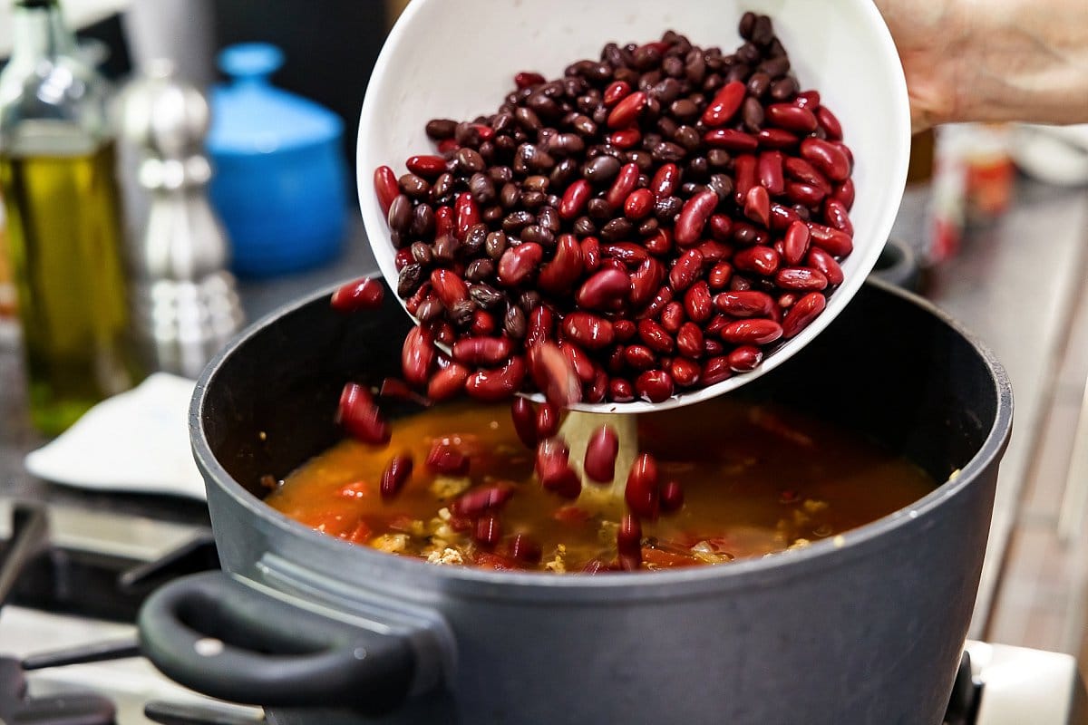 Next, drain and rinse beans, then add to the pot.