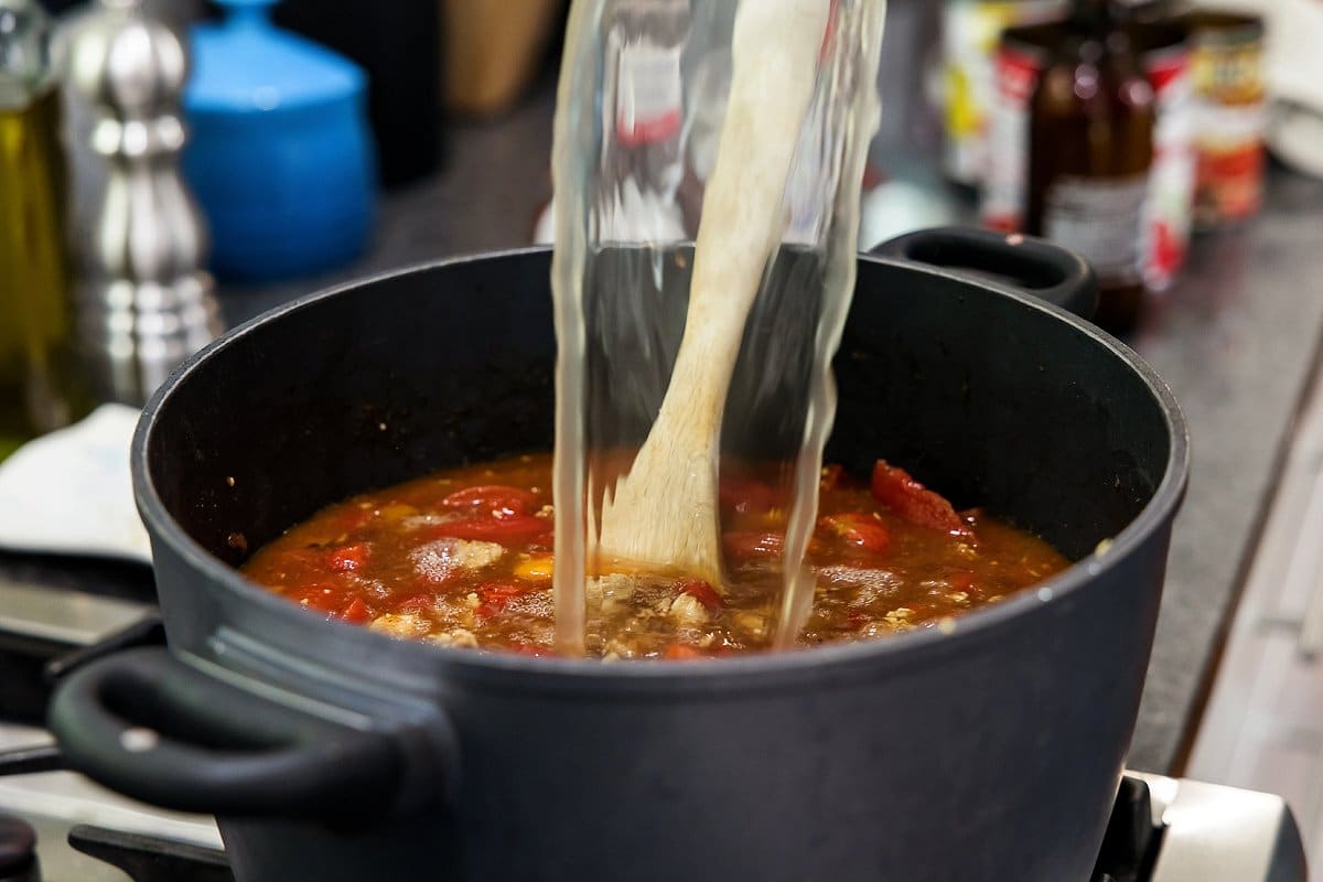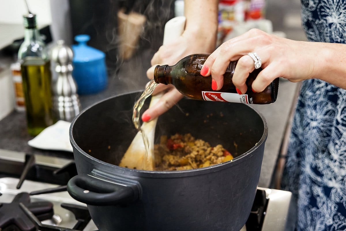 - Add beer to deglaze, scraping up brown bits on bottom of pan using a wooden spoon.
