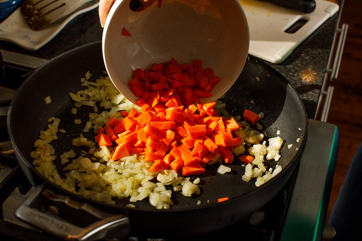 - Heat coconut oil in a deep skillet over medium high heat. Add onions and carrots plus a pinch of salt and pepper. Cook until tender, about 7-9 minutes, stirring frequently.