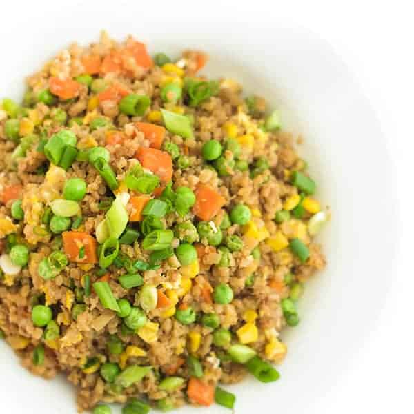 A healthy spin on the Chinese takeout classic, this vegetable fried rice is made with riced cauliflower then seasoned toasted sesame oil and fragrant ginger.