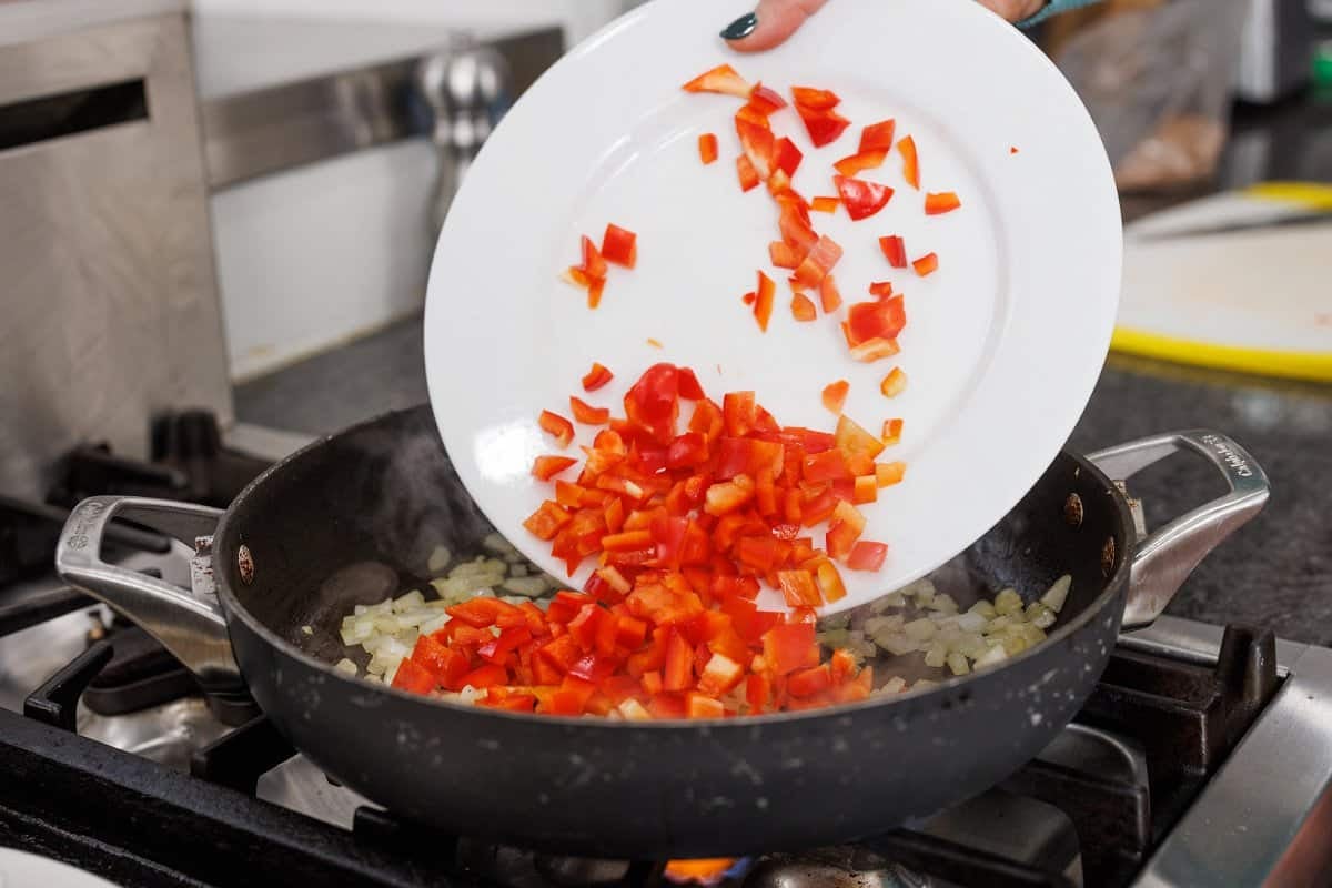 After the onion has cooked for a couple minutes, add the red pepper and continue to sauté.