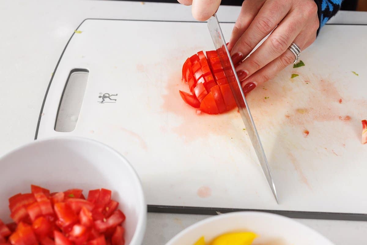 Dice the tomato, and slice your carrot and celery into small pieces before setting it all aside.