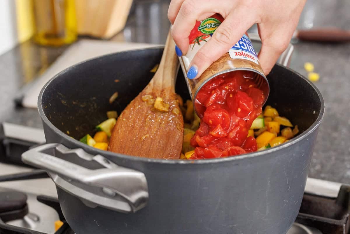 Then pour in the diced tomatoes and add the lemon zest; stir to combine.