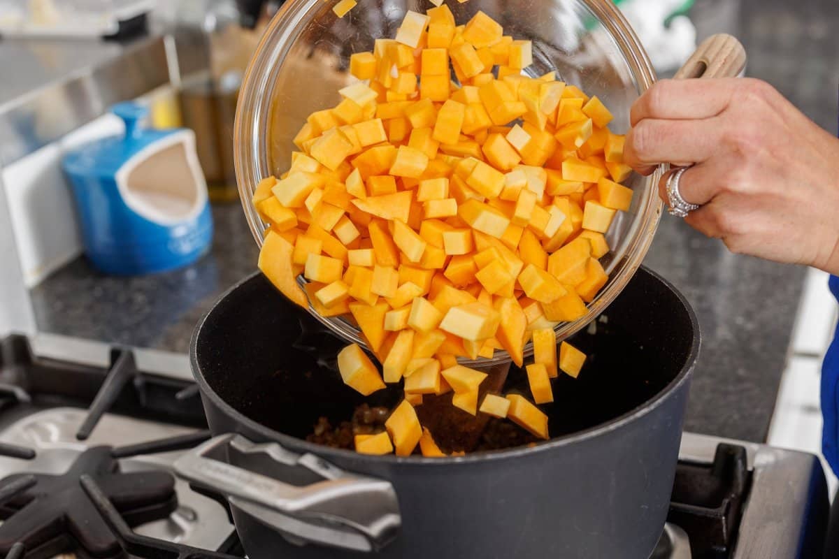 Start your Vegetable Tagine with Chickpeas by washing and peeling your vegetables and then cutting them into bite sized cubes.