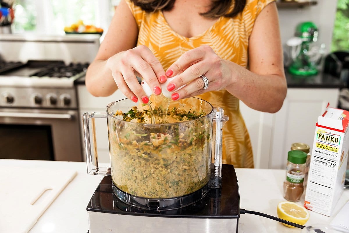 - Place the first 9 ingredients (chickpeas through egg) in a high speed food processor and pulse on high until the mixture is smooth and everything is evenly incorporated. (It’s ok if it’s slightly chunky – texture is good.)