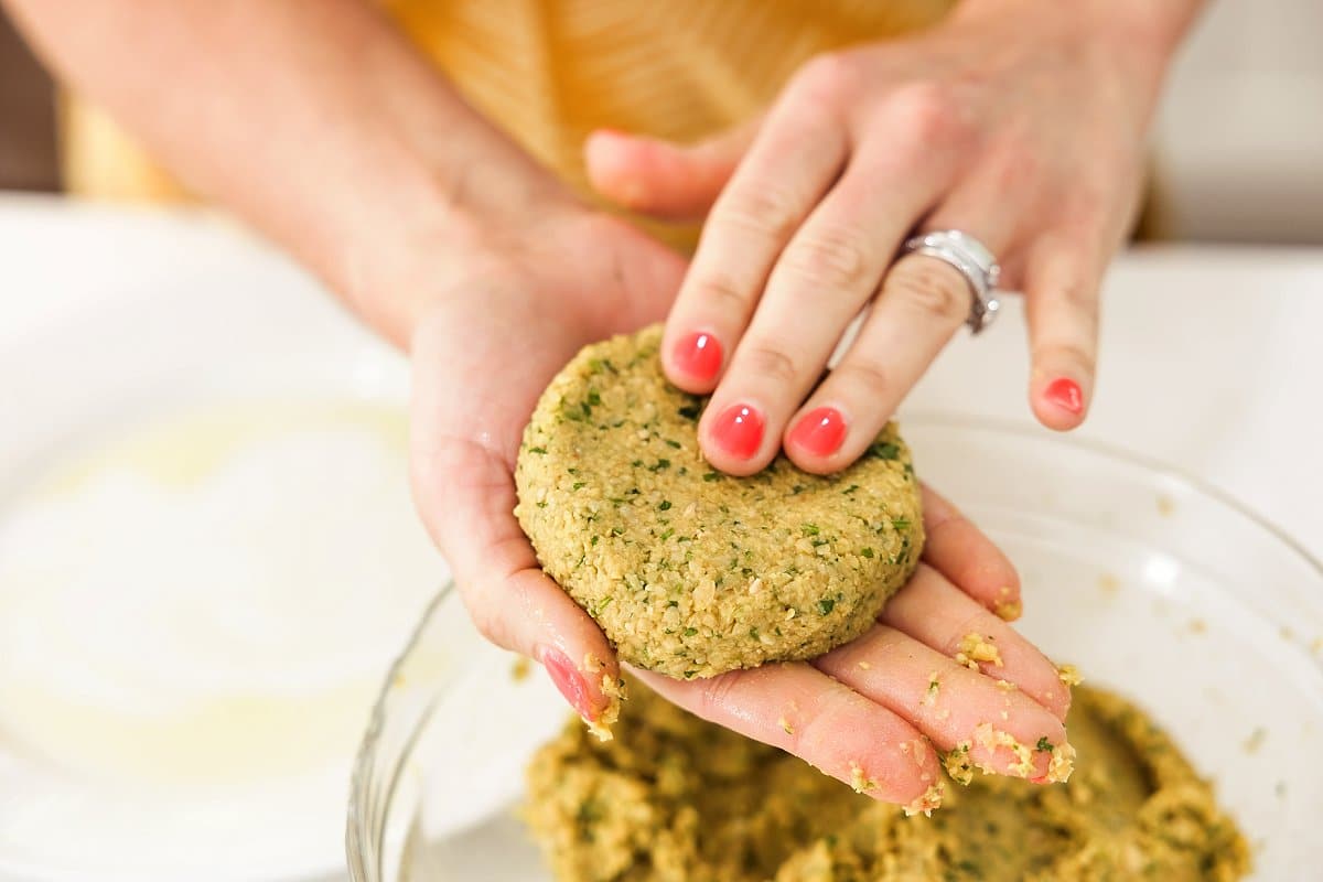 To make this process easier, divide the bowl mixture into quarters with your hands to create four patties. This is one of my favorite parts of the process — it’s fun and therapeutic!