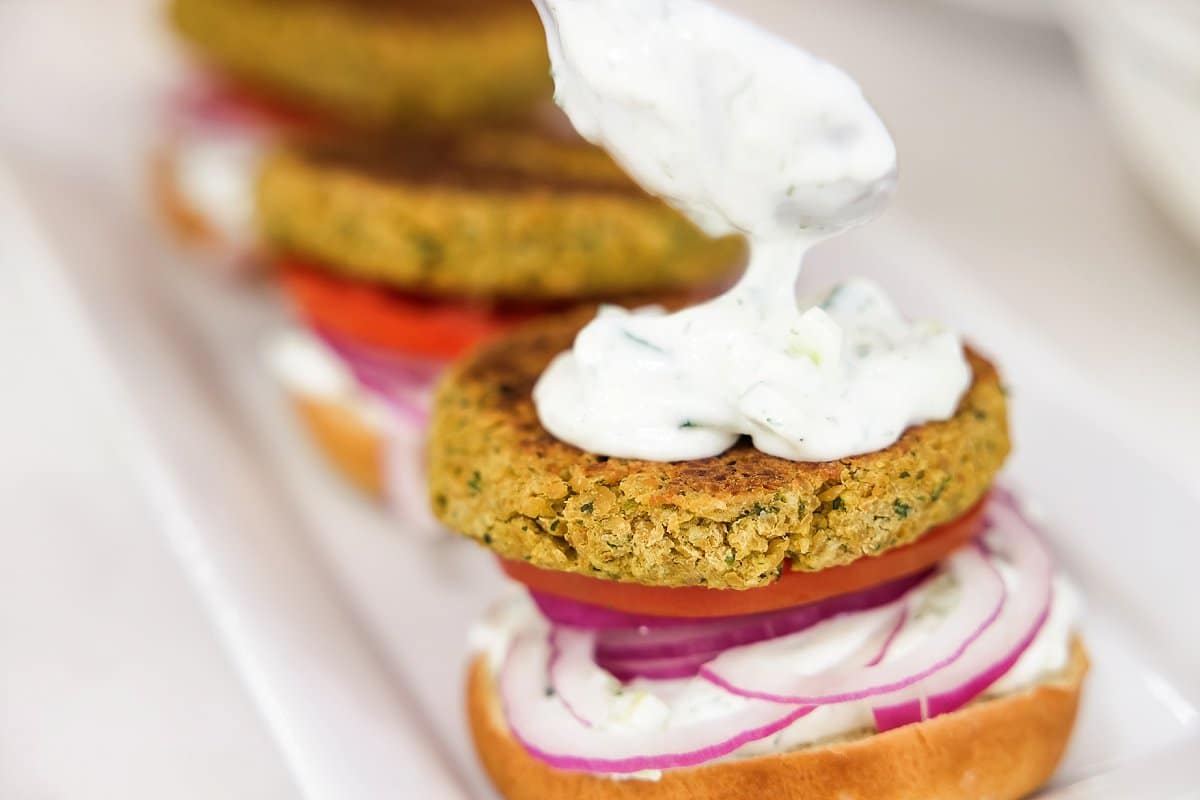 Finally, to serve the vegetarian chickpea burgers, place one patty in between each hamburger bun and top with tzatziki sauce. You can also add other preferred condiments.