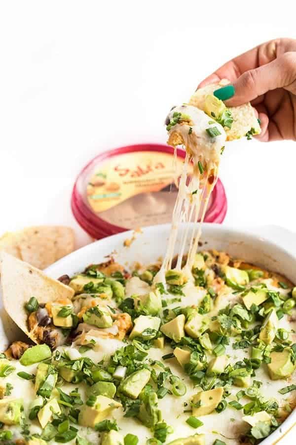 This quick and easy vegetarian appetizer recipe is made with two types of beans, spicy hummus and plenty of shredded cheese before it is baked until warm and bubbly. The ultimate party dip!