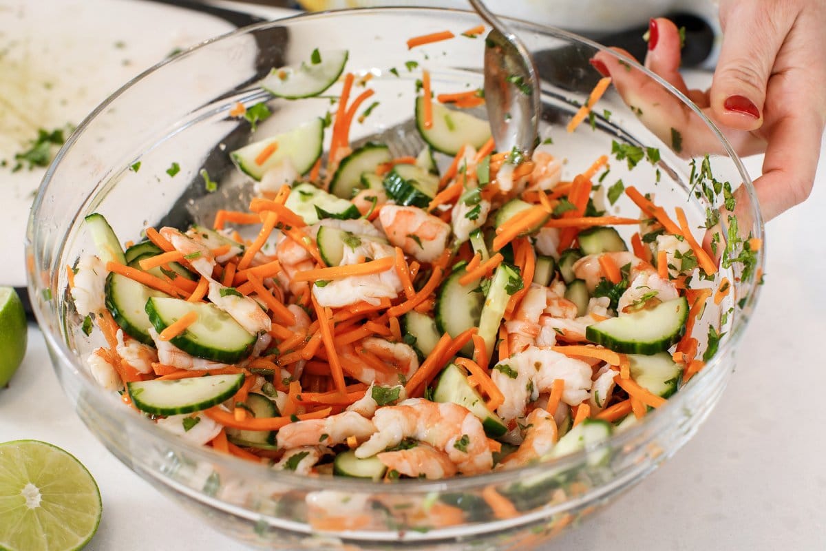 This light and refreshing Vietnamese Shrimp Salad is made with crisp cucumber, meaty shrimp, and tangy chili paste to emulate your favorite fresh rolls in a bowl!