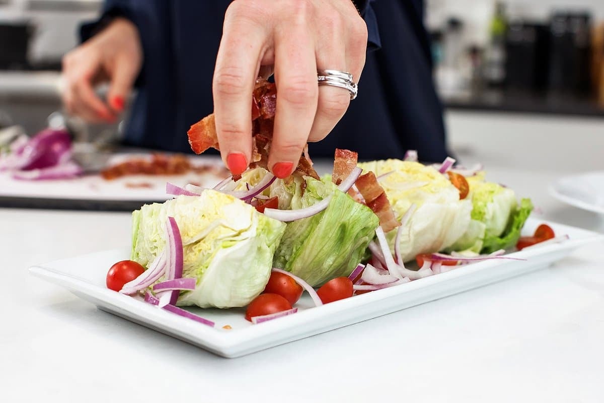 - Place iceberg lettuce wedges on a large platter and scatter with sliced onion, tomatoes and bacon pieces.