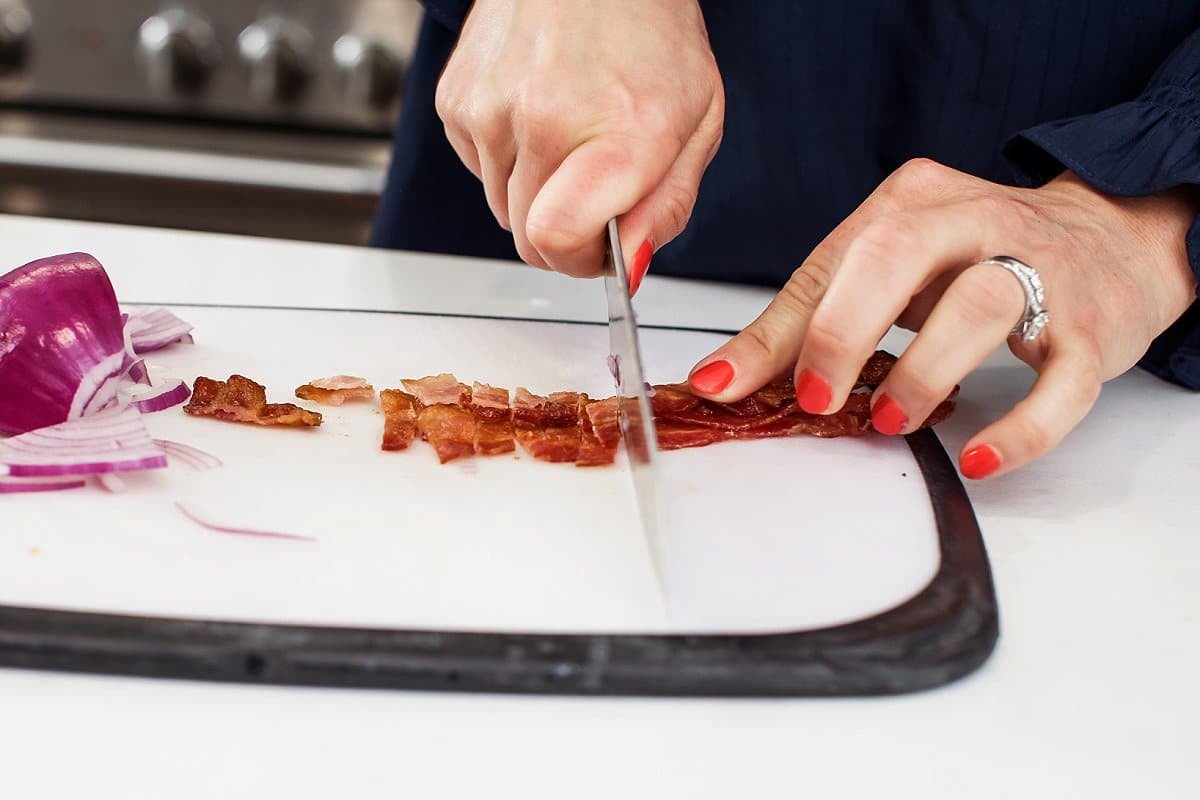 Next take some crispy cooked bacon and cut it into smaller pieces. Alternatively, you could just use bacon bits.