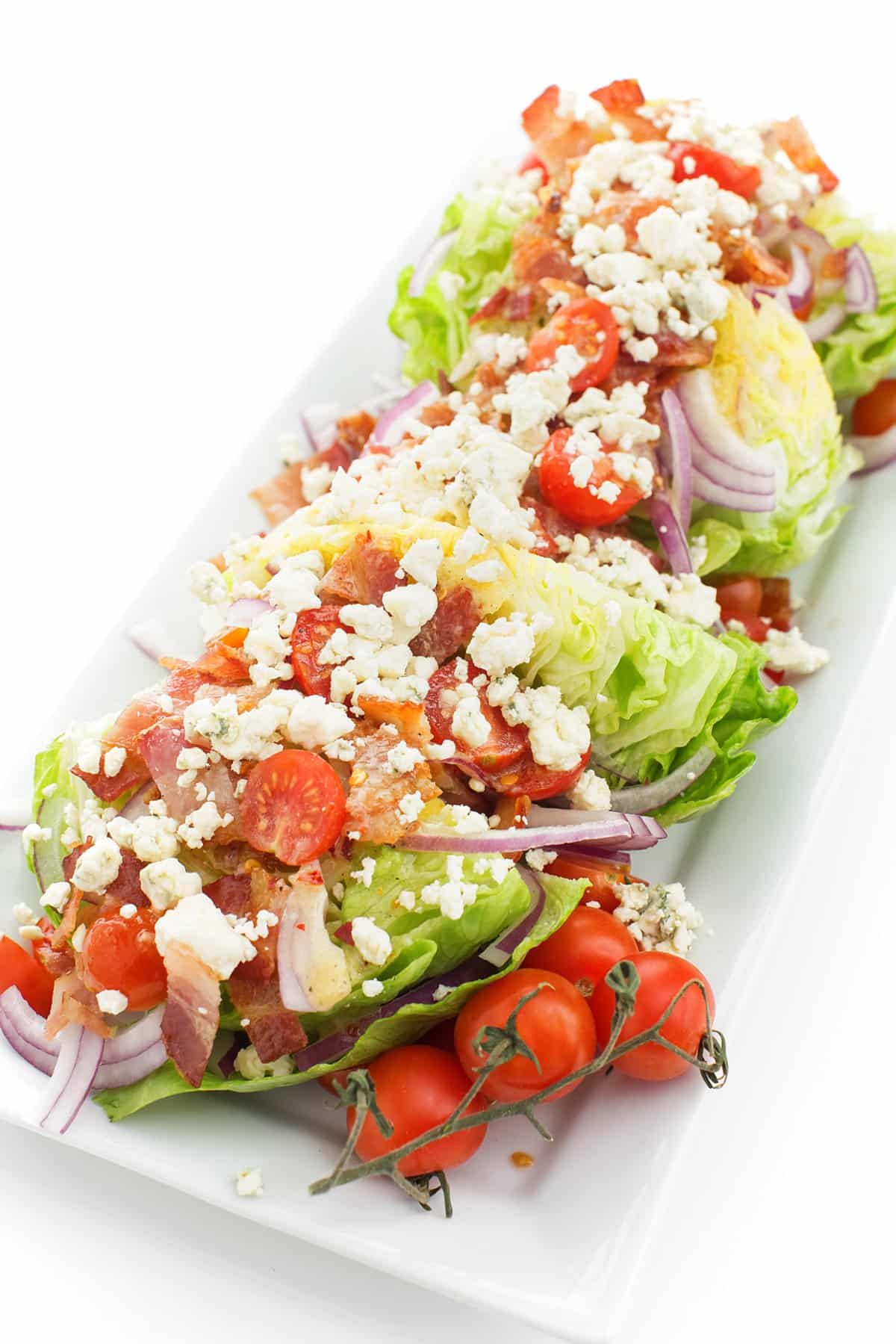 This crisp and refreshing wedge salad is made with iceberg lettuce, juicy tomatoes, crispy bacon, and drizzled with a garlicky blue cheese vinaigrette.