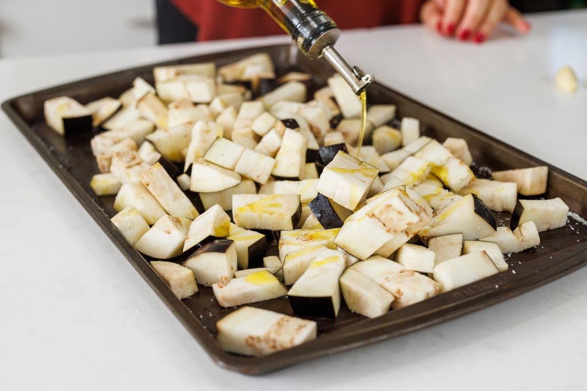 - Spread eggplant cubes on baking sheet in one layer and drizzle with half of the olive oil (two tablespoons), half of the salt (1/2 teaspoon) and half of the pepper (1/4 teaspoon). Use hands to mix around to make sure cubes are evenly coated with oli and spices.