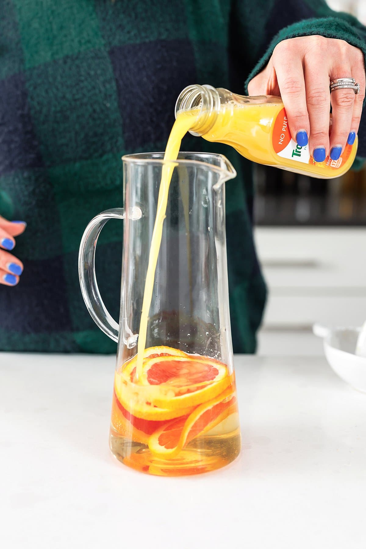 Then in a large pitcher, pour in your choice of white wine. I added orange slices for fun, and is totally optional.