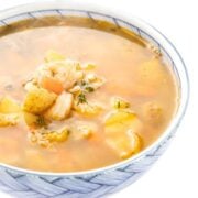 Add garlic and thyme to the pan along with scotch bonnet pepper if you want it to be spicy. (Leave out the pepper to keep mild.) Saute until fragrant, about 30 seconds. Add potatoes to the pan, along with chicken broth, and stir well.