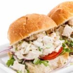 A lunchtime classic, these chicken salad sliders are served on whole grain rolls and made with real mayonnaise and a splash of tangy dill pickle juice.