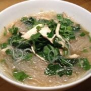 Divide rice noodles evenly between four bowls and top with 3 cups of soup in each bowl. Ladle chicken soup on top of noodles and garnish with plenty of toppings like fresh cilantro, bean sprouts and lime wedges.