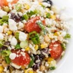 In a medium bowl, combine brown rice with tomatoes, chickpeas, cucumber, scallions, corn, feta and olives.