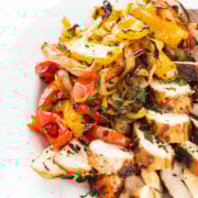 In a large resealable plastic bag, add all of the grilled vegetables ingredients (peppers through ginger.) Seal tightly and toss well to coat evenly.